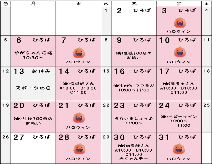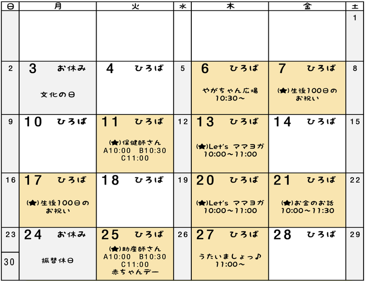 16日(木)『Let'sママヨガ』(9:30〜11:00まで)、24日(金)『ベビーサイン』(9:30〜11:00まで)